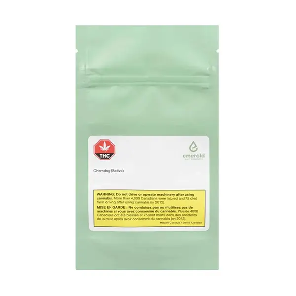 Chemdog dried flower by Emerald is a legendary hybrid linked to Nepalese and Thai sativa landraces and crossed by U.S breeders during the 1970s. The sticky buds and leaves appear silver from a coating of white trichomes that give off an earthy aroma of citrus and lavender.