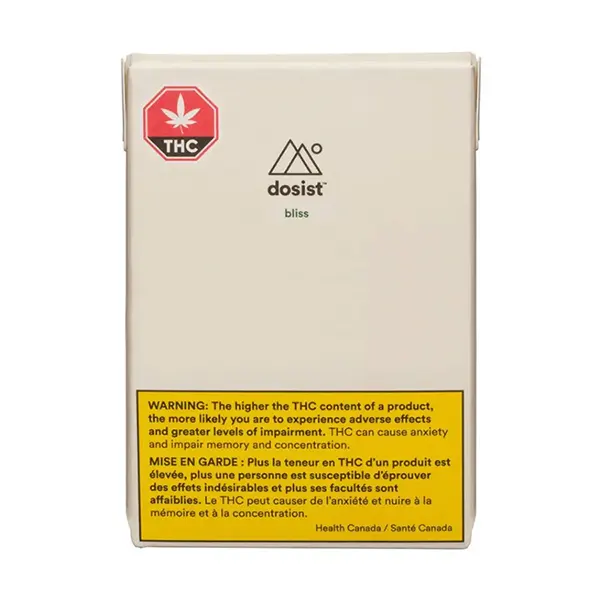 Bliss Formula Pod by Dosist has a 9:1 THC-to-CBD ratio designed to help you feel the right amount of good. This formula stimulates CB1 receptors with THC. The pre-filled formula pod™ offers 200 doses (2.5mg per dose) and provides a precise dose every time. The formula pod is part of the dose pen rechargeable system by dosist that connects exclusively to the dose controller, sold separately. The dose pen rechargeable system by dosist uses superior vaporization elements designed to heat our formulas to a precise temperature and to deliver a dose quickly and accurately. Consistent dosage is provided through three key features: optimized temperature control, airflow control and time control. The dose pen is easy to use. Just inhale at a normal, consistent rate, and the vaporizer will shut off automatically after 3 seconds. A slight vibration will inform you when you’ve received the precise amount of 2.5mg of your chosen formula.