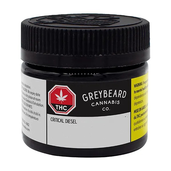 Critical Diesel by Greybeard is a top-shelf, sativa-dominant strain with high-intensity notes of cherry, grape, strawberry, vanilla, and gas that’s reminiscent of a fruity candy wrapper. Grown indoors and harvested and cured in Pemberton Valley, BC, Critical Diesel offers long, grandiose buds in crisp greens interspersed with purple streaks. A legend like no other, this high quality, high-terpene craft flower is derived from proud and renowned Critical Sensi Star and Driftwood Diesel genetics. Hang-dried and hand-finished with an included humidity pack for freshness.